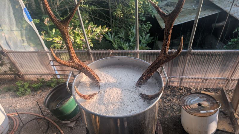 行って見ると いい形の角をした鹿でした、早速いただいて帰り、今朝から鹿角トロフィーの製作に入りました。