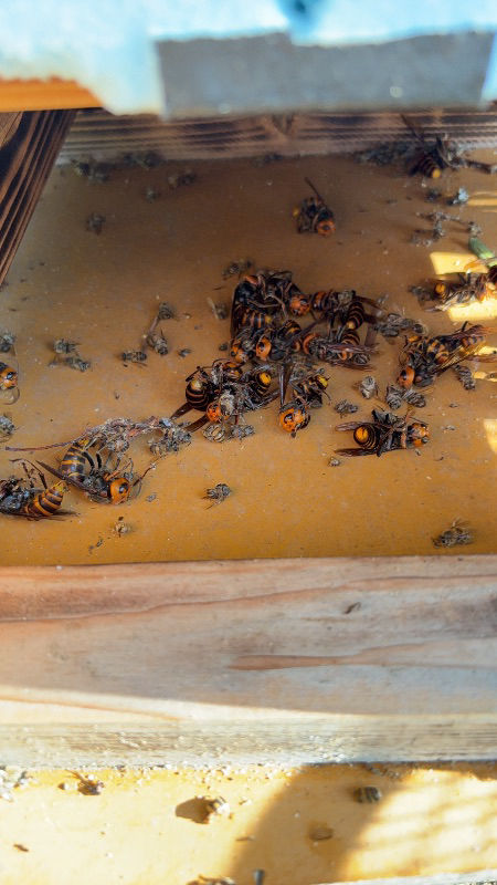 うちの新入居群にもオオスズメバチの襲撃を受けました。まだうちは体制の整っていない入居群への襲撃だけで、最初は3匹程が襲撃に来てたのですが、私が追い払うと一旦新入居群を離れて近くの強勢群の巣箱へ急襲をかけにいきました。が!さすが強勢群!籠城どころかゾロゾロと巣箱から出てきてブルブルと威嚇し応戦体制、追い払ってしまいました( ̄▽ ̄;) (その後新入居群へ戻ったスズメバチを捕まえてホイホイへ) ホイホイを設置し今の所は新入居群も無事でいます(๑و•̀ω•́)و