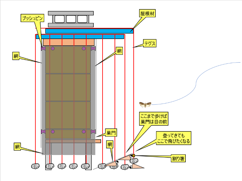 次にスズメバチが越えてこれるかみます。できれば、スムシの羽根を拡げた寸法より詰めて、スムシの侵入も防ぎたいトコなので、100mm間隔の千鳥2列にしてオフセットすれば、直線的にしか飛べないスムシは1列を躱しても2列目に当たって落ちないかなぁと考えてます。