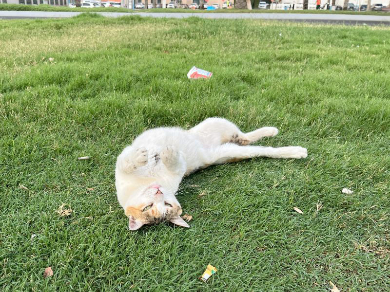 イスラム教では猫は神聖な生き物らしく、野良猫にも寛容で、その辺に沢山います!夏、日中は50℃近く上がる日もあるので、緑地帯の茂みの中に隠れていたり、冷気が漏れる建物の軒先に避難していたりします。また、街中で野良猫に水や餌を与える人々をよく見かけます。ただ、病的に痩せているものも多く、無責任に餌を与えて増やすのもどうなのかなぁーと思いますね。