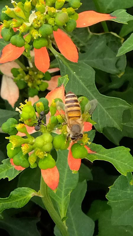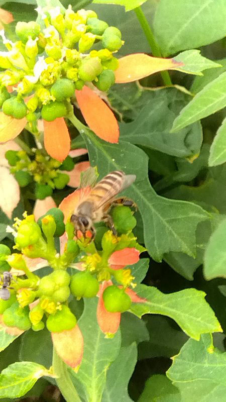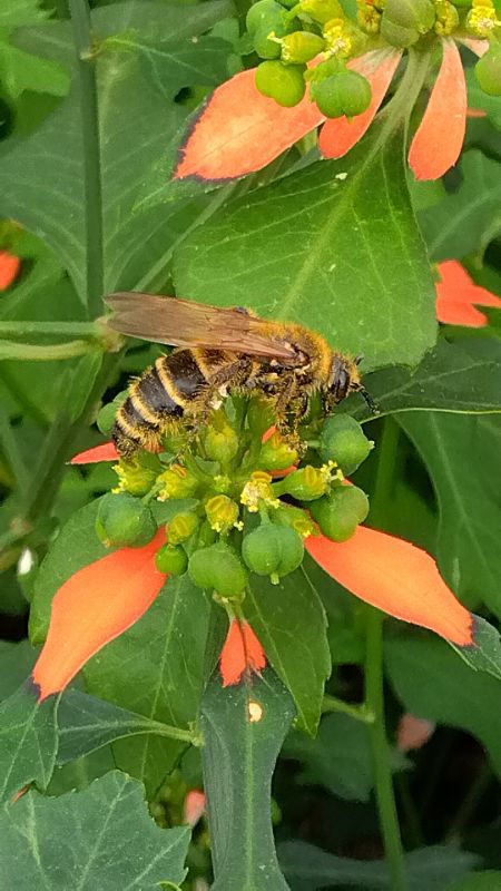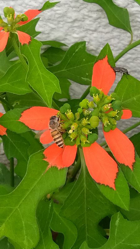 3年前?に、私も訪花しているのを目撃し、日誌に書いたら、たしか、ハッチさんだと思いましたが、教えていただきました。チョッと、クリスマスのポインセチアに似てると思ったんです。