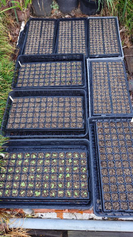 手前左から時計回りに、白菜、レタス、ブロッコリー、玉ねぎ4トレーで最後がレモンバーム。日が暮れる中、細かいことはお構い無しに急いで播いたので、3粒とか落ちてるセルもある。玉ねぎは気合いれて丁寧に播いたが、レモンバームは微細な種でもう暗くて見えなかったし(汗)