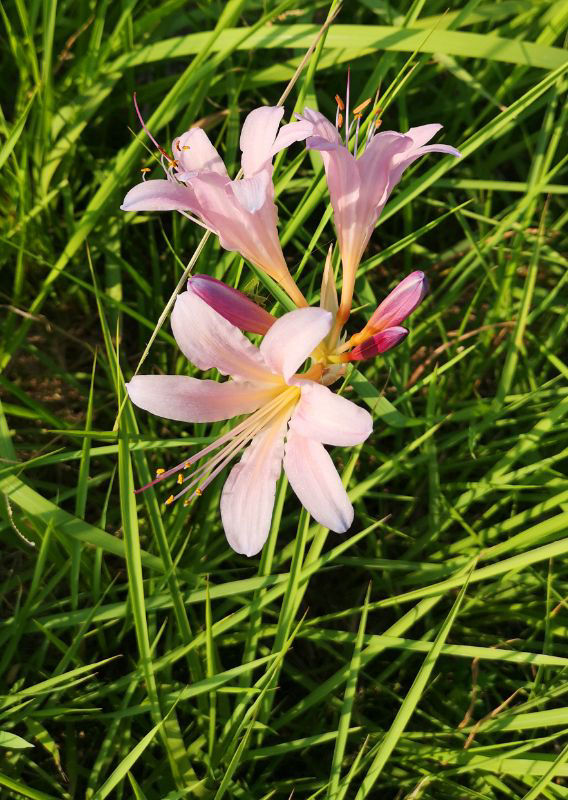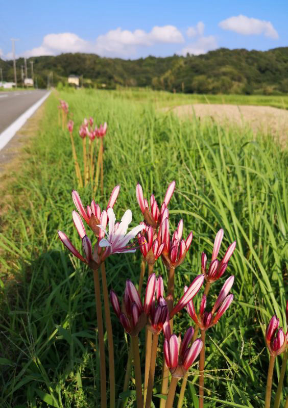 調べてみたら、彼岸花の仲間のリコリス・スプレンゲリと言うのだそうです。でも、ピンクの彼岸花と一般化されています。田のクロに並んでいたので、どなたかが植えたのかな~。ピンクが可愛いです。