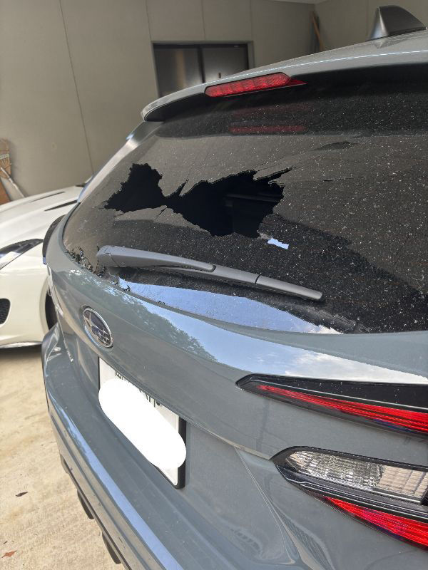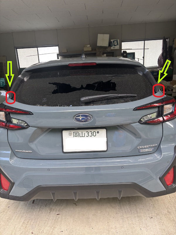 何気なく庭に出て車庫の前を通りかかったら車のリアウインドウに何やら黒い模様のようなものが見えたので近付いてみると、何とリアガラスが割れている‼