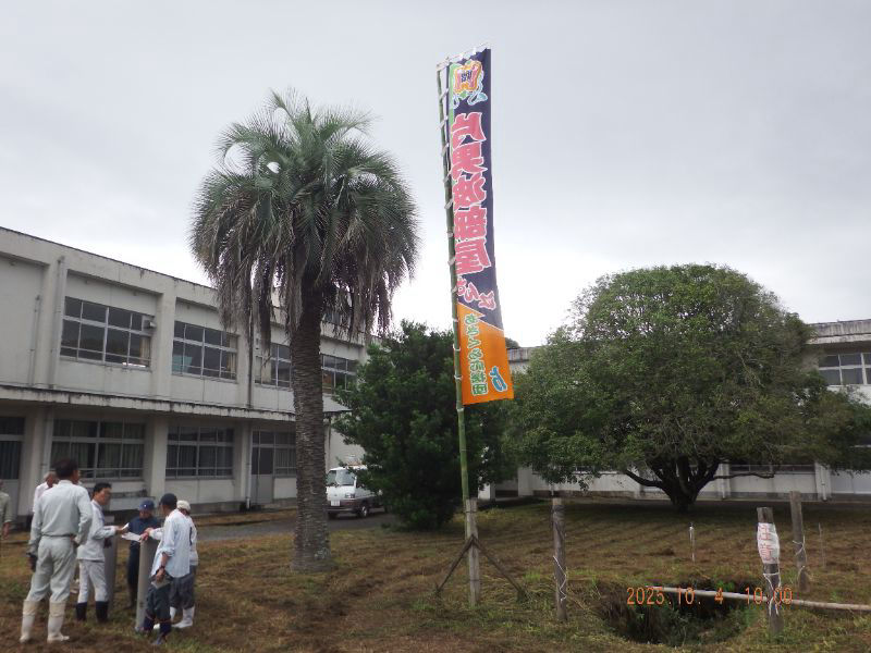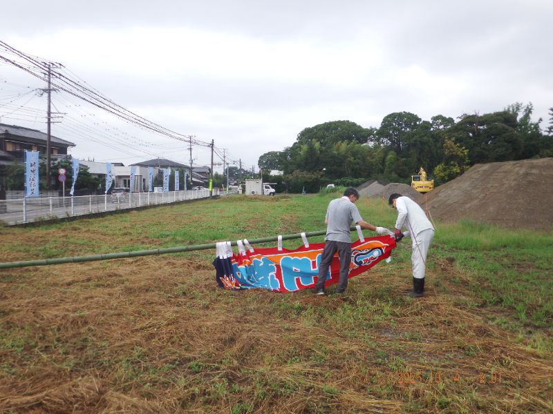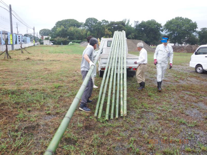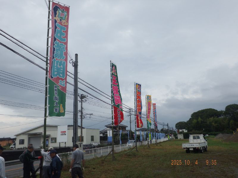令和7年10月4日 土曜日 大相撲九州場所:片男波部屋歓迎会の準備をして居ますね。8mのマタケで登りを立てましたね。