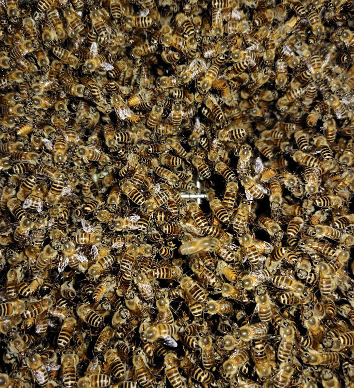 6段目の巣落ち防止バーが少し見えるが巣板長さは不明。この巣箱は昨年捕獲、越冬後今年の春、採蜜を2段実施した。尚、給餌室には盛りあげ巣有り(盛り上げ巣の蜜は別に採取予定)