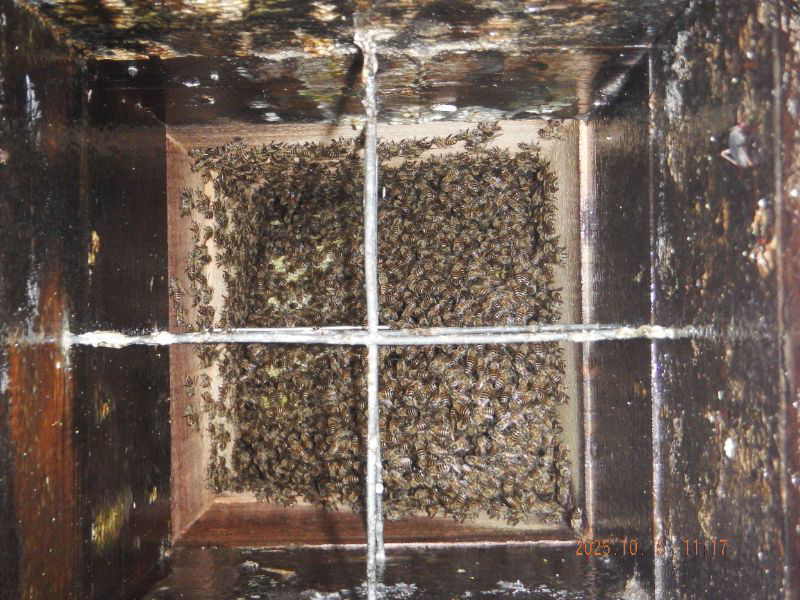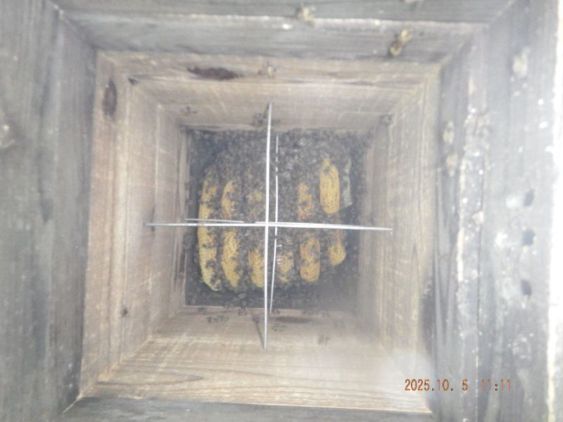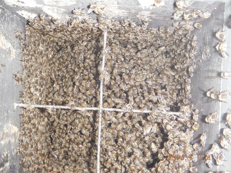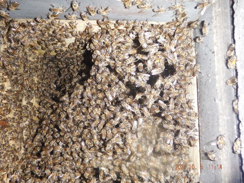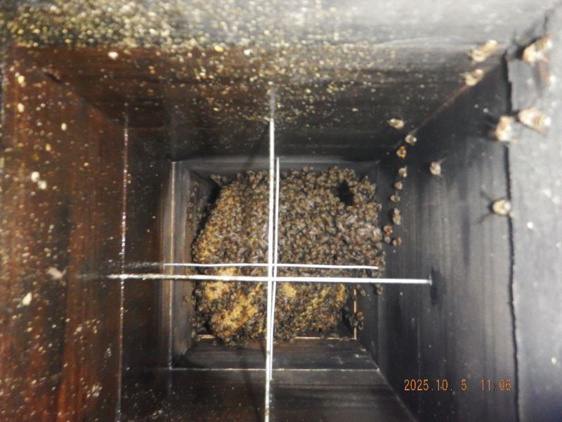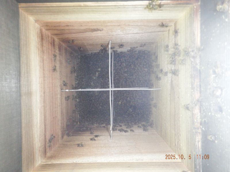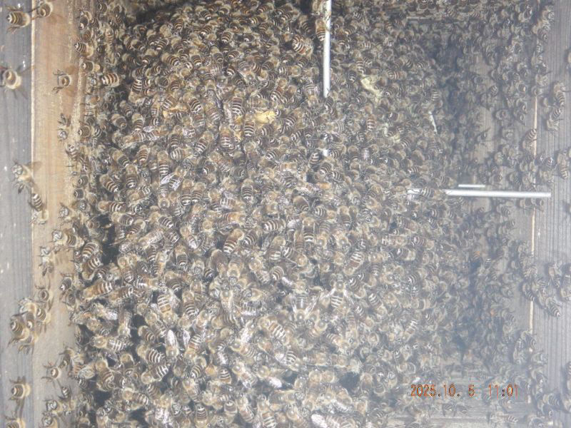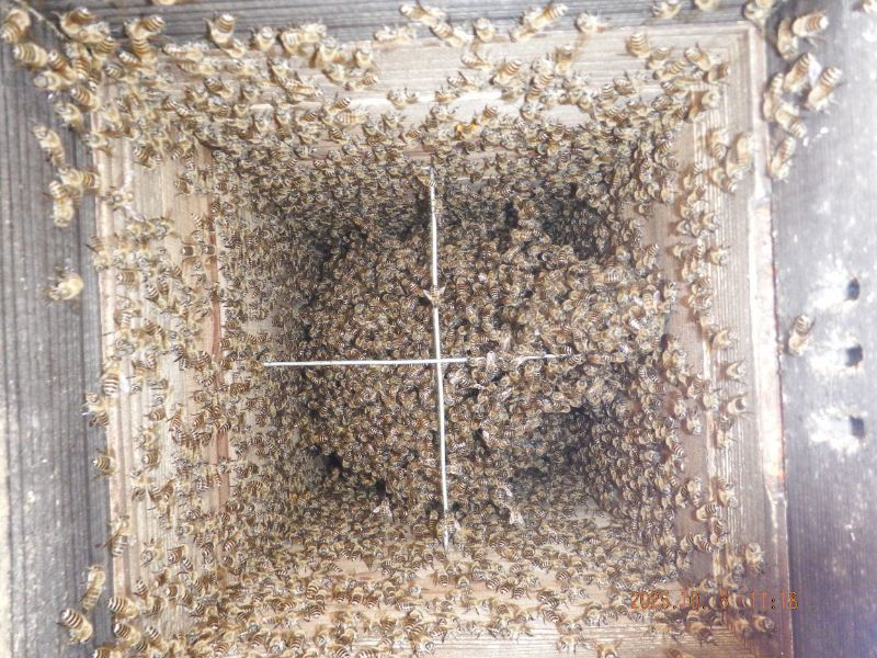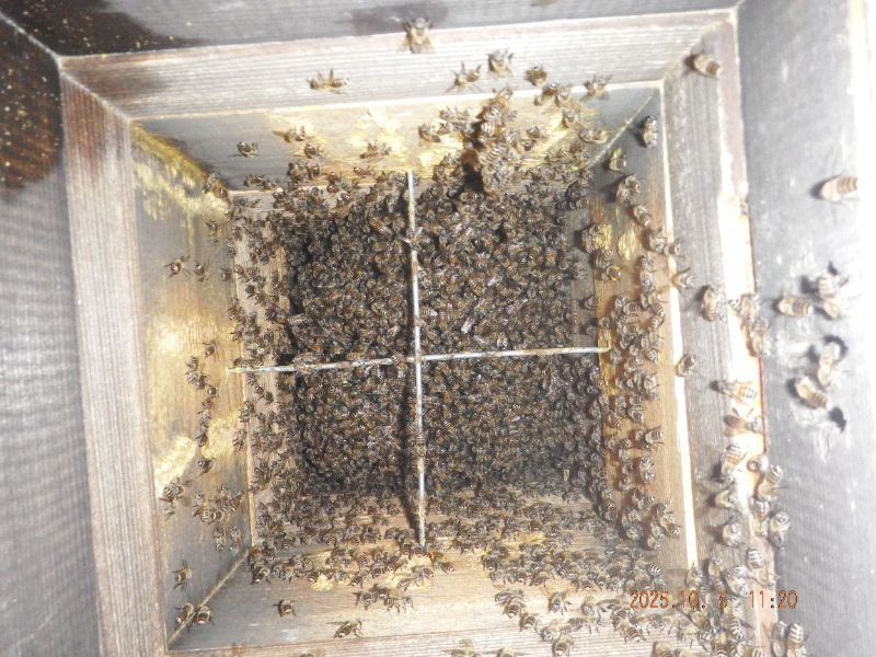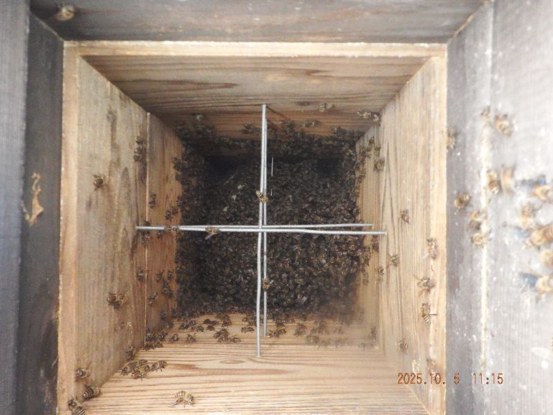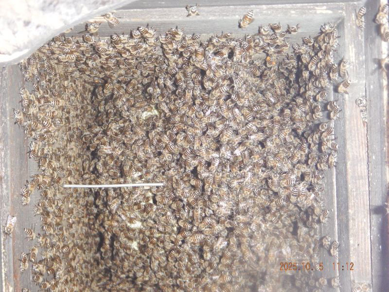 5段目と6段目の巣落ち防止棒が見えていますね。蜂が少なくなっていますね。