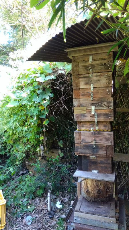 ’25.10.4. ケフは南竹藪群の継箱、採蜜をと始めたが、5年越しの木製リフトがぶっ壊れたので止め。