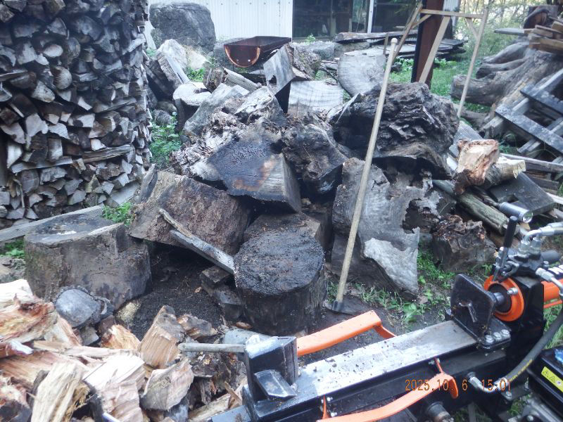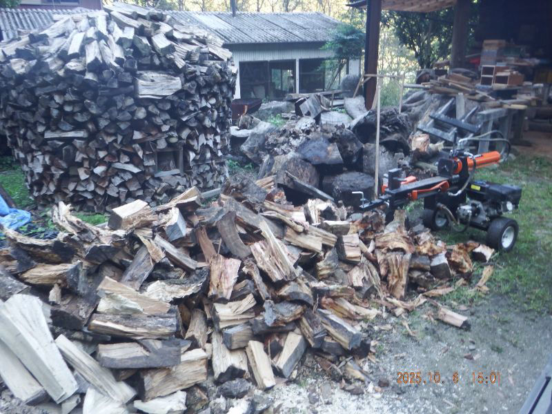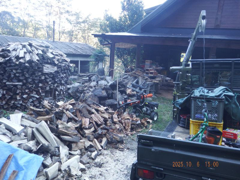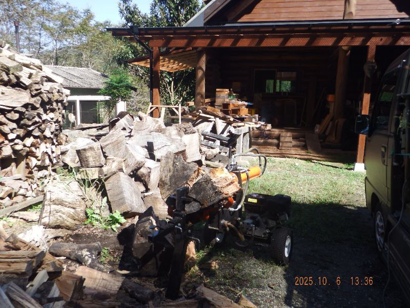 令和7年10月6日 月曜日 大分山荘にて:楠木を薪割りしましたね。最初にクレーンで吊って居るのは欅ですね。3分の1だけ割りましたね。楠の根元なので、簡単では無い