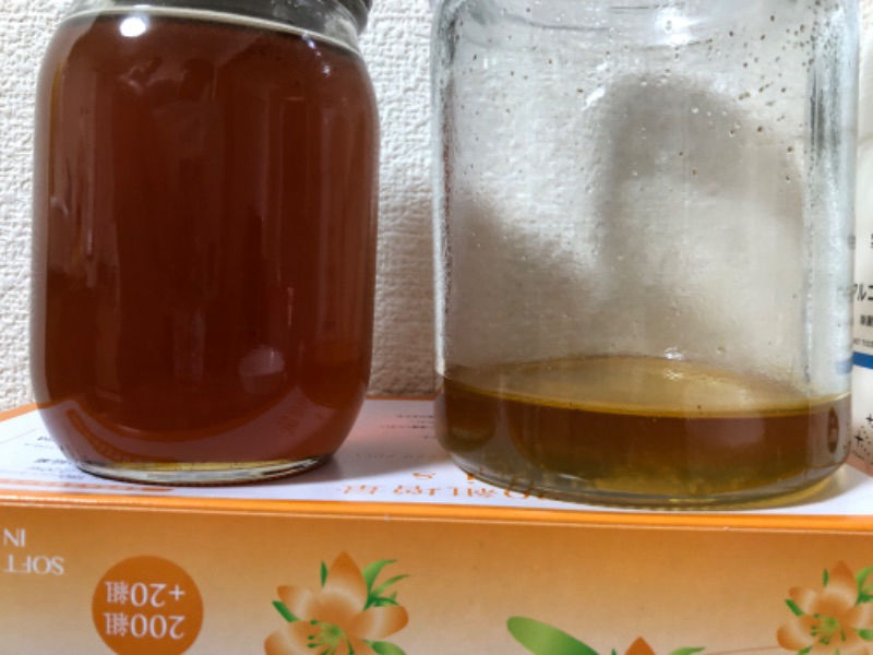 昨年よりも粘度が低く香りが爽やかで色味は茶色がかっている蜜でした。セイタカアワダチソウが咲く前でしたので、香りも良く黄色味が少なく熟成も少し甘い蜜になったのかと思います。