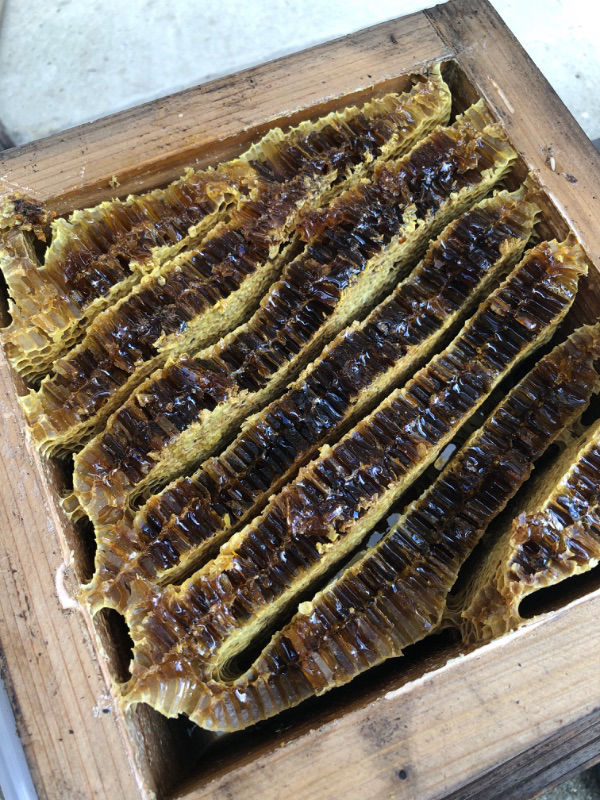 今年は昨年よりも蜜が溜まっておらず焦りましたが、重箱を逆さまにしたら溜まっていて安心しました。
