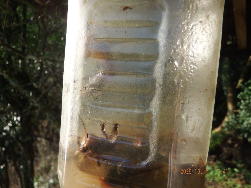 ゴジラさん ~~~ヾ(^∇^)おはよー♪ございます。カルピスウォーター:5 食酢:1で、普通はして居るのですが、焼酎(お酒)が有るので、作って見ましたね。1匹でも入ればと思ったのですが、ペットボトルからもフェロモンが出るのか、スズメバチが見えるので入るのか、夕方又入って居ましたね。コメント有難う御座いました。