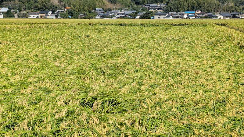 先日と昨日の雨で稲が倒れた田圃が十数ヶ所見受けられます。