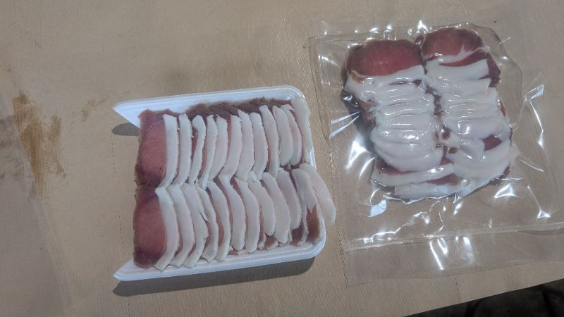 スライスした肉を片方を切り取ったプラ容器に並べて袋に入れ、反転し上から叩き容器を抜きます。