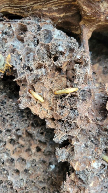 居なくなったキイロスズメバチ達の真相を探るために解体してみる事に。早速解体するとスムシでいっぱい。スズメバチに寄生するメイガの一種かとおもったけど巣の奥からウスグロツヅリガの成虫が出てきたのでミツバチに付いてるのも居るみたい(多分メイガも居る) 羽化直前の成虫も確認。