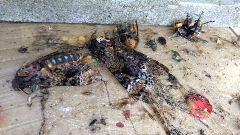 ⇩は欅(けやき)群の屋上ペッタンコ、スズメ蜂も数匹付いて居るが、今日はメンガタ蛾が2匹も付いて居た。この箱には今季既に4、5匹来ていたが、2匹には驚いた。