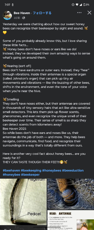 蜂は鼓膜や外耳を持ちません、代わりに振動を通して"聞きます" 彼等の触覚には小さな空気の動きや振動を捉えることの出来る特殊な器官(ジョンストン器官)を持ってます。それは他の蜂の羽音や環境の変化、巣箱近くの貴方の声のトーンまで聞き分けます。