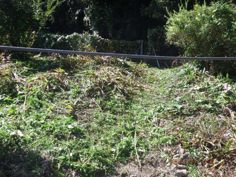 上の出入り口からも多く出入りして居ますね。今日は解体しようとか、思って来たのですが、花粉を運んでいるので、巣箱周りの草刈りを行いましたね。
