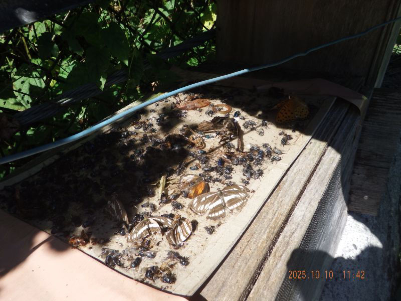巣箱の後ろに置いているネズミ捕りシートにはスズメバチは最初に付けたキイロスズメバチだけで、他の蛾とかの虫が多いですね。