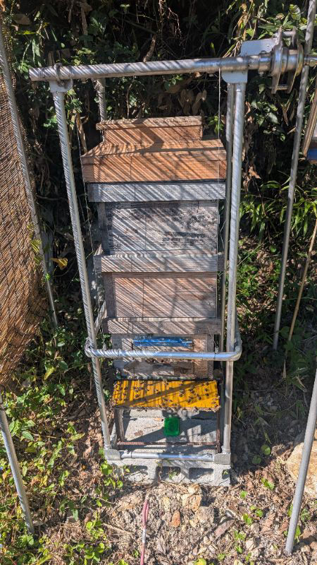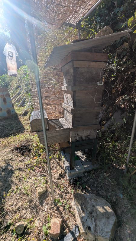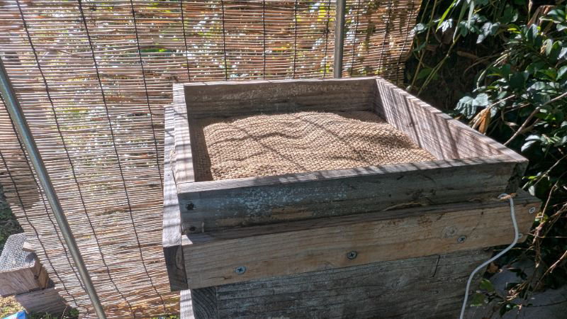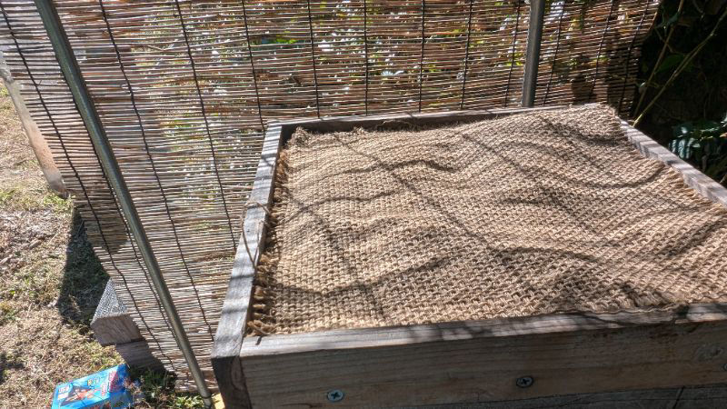 東から撮影。 巣箱と天蓋の境に黒く見えるのは 隙間ゴムです。 天蓋に張り付けています。