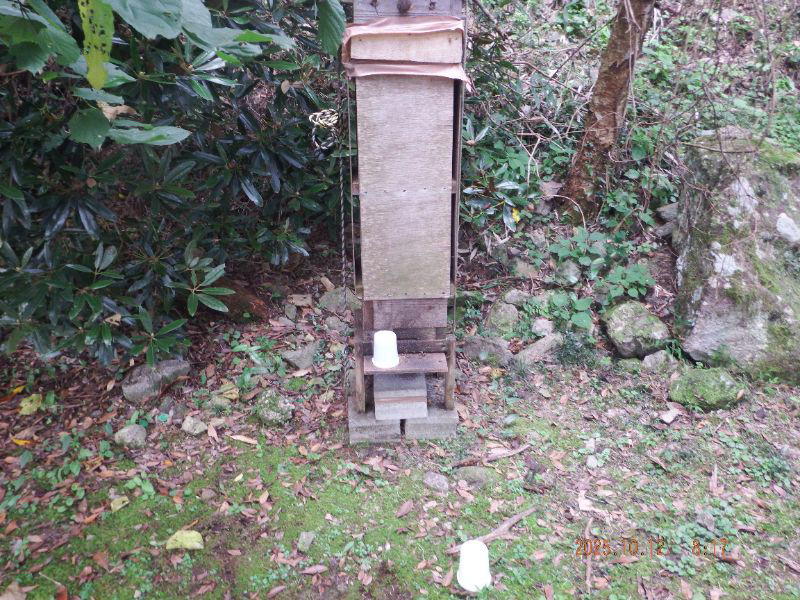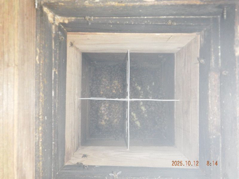 令和7年10月11日 土曜日 自宅蜜源樹の森:家庭菜園へ大根の状態を見に行くと、巣箱から日本ミツバチが出入りして居るので、確認すると入居して居ましたね。
