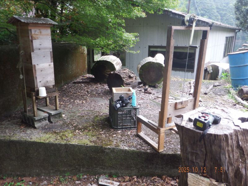 令和7年10月9日 木曜日 大分山荘にて:No.3自然入居群の屋根に、ネズミ捕りシートを張りましたね。急にオオスズメバチが来るように成りましたね。薪割り機がパン
