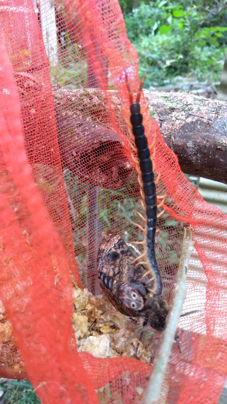 ⇧ 柿木群外検、異常なし。 ⇩ 箱の1m前方に巣屑入りネットをぶら下げて置いたら、メンガタ蛾がネット袋に訪問。ムカデ殿に食べられている。
