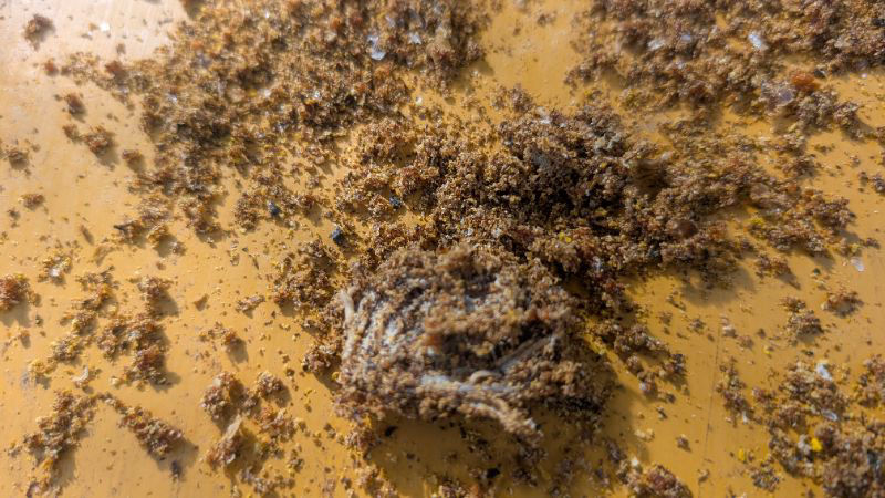巣門箱から黒すぐり〇入りの糖液を与えても表面が巣屑とサナギ、蛆が浮いて糖液の消費も少ないです。
