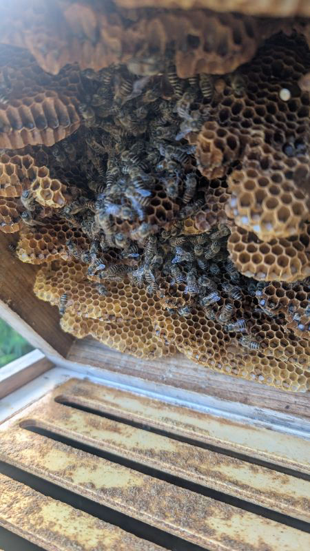 貯蜜はないようです?巣板に頭を突っ込んで蜜をあさっているちびっ子もいる様です。