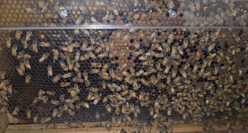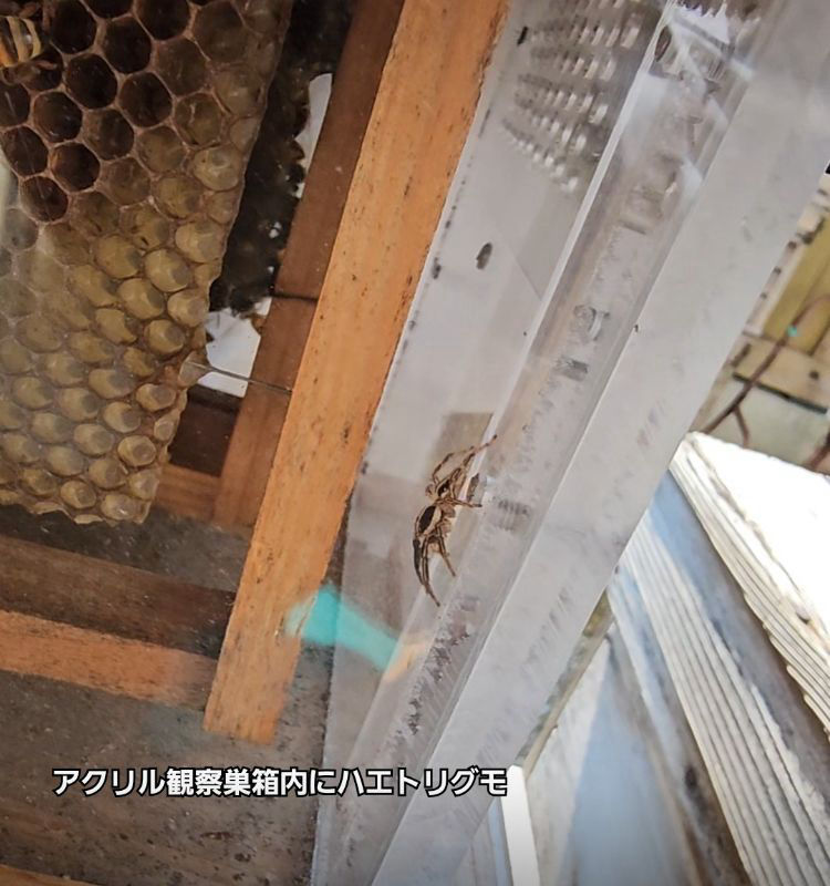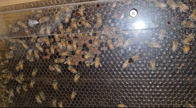 オオスズメバチの来襲で外勤蜂の殆どが居なくなっていたアクリル観察巣箱の西洋ミツバチ群
