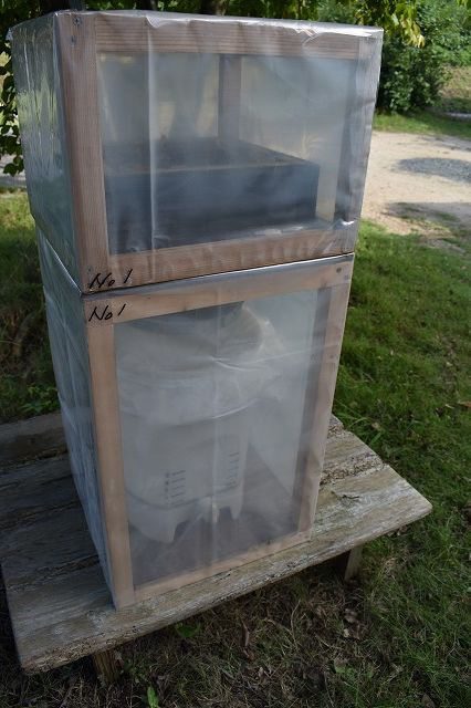 この前作った離蜜器具を貸出して、垂れ蜜方式の確認です。
