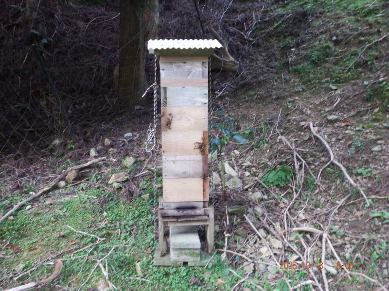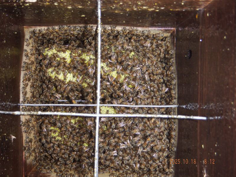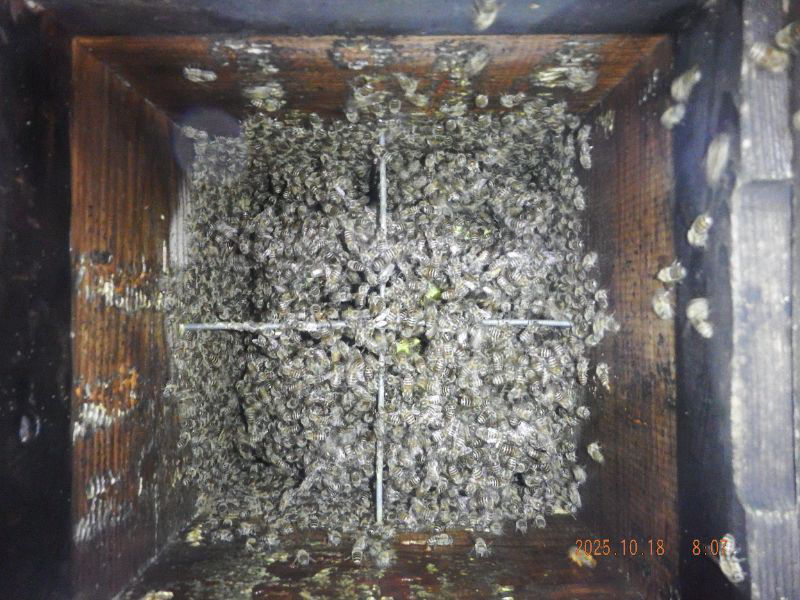 6段目の巣落ち防止棒が見えていますね。今年採蜜も考えないと空間が無くなりますね。もう少し様子を見ますね。