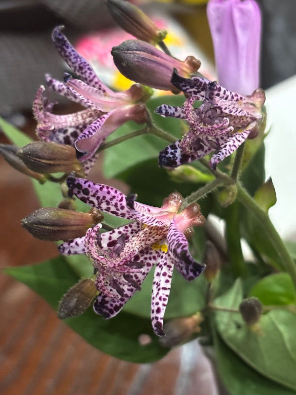 花は、ホトトギスと言う花とホシアサガオが生けられているようです。? (画像検索で調べました。(^_^;))