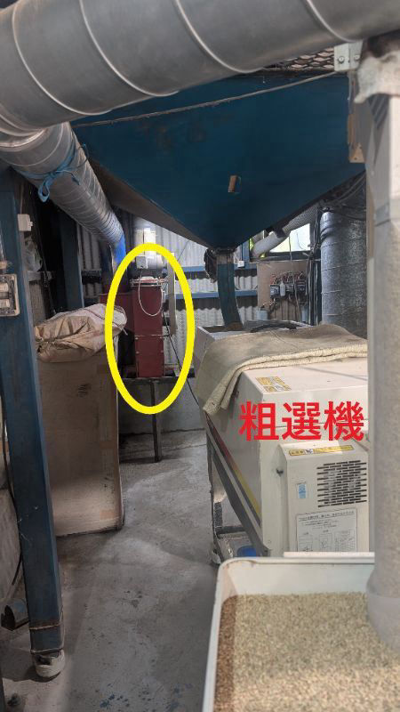 籾摺り機から出たもみ殻は搬送機(黄色丸)で農舎に隣接したモミガラ貯蔵タンクに送っています。