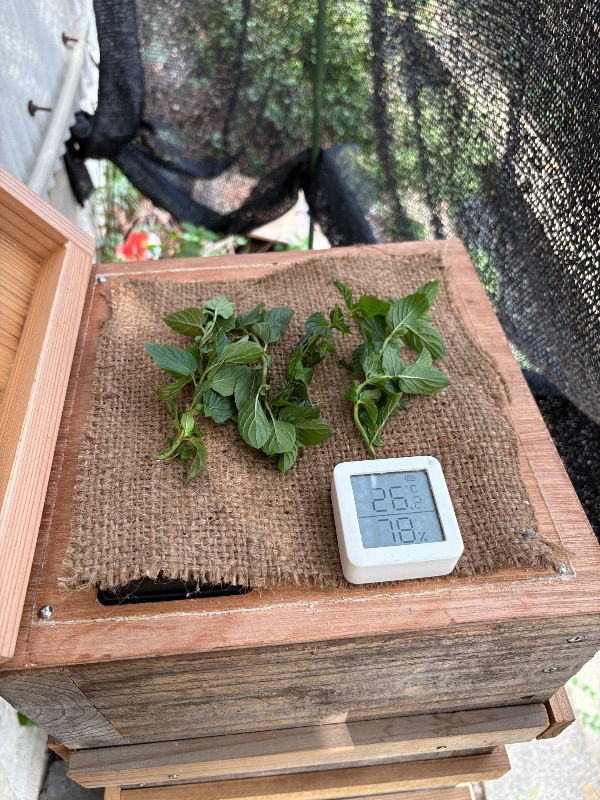 また、すぐ近くに繁茂しているニホンハッカ生葉を載せて、ミントに慣れてもらおう。
