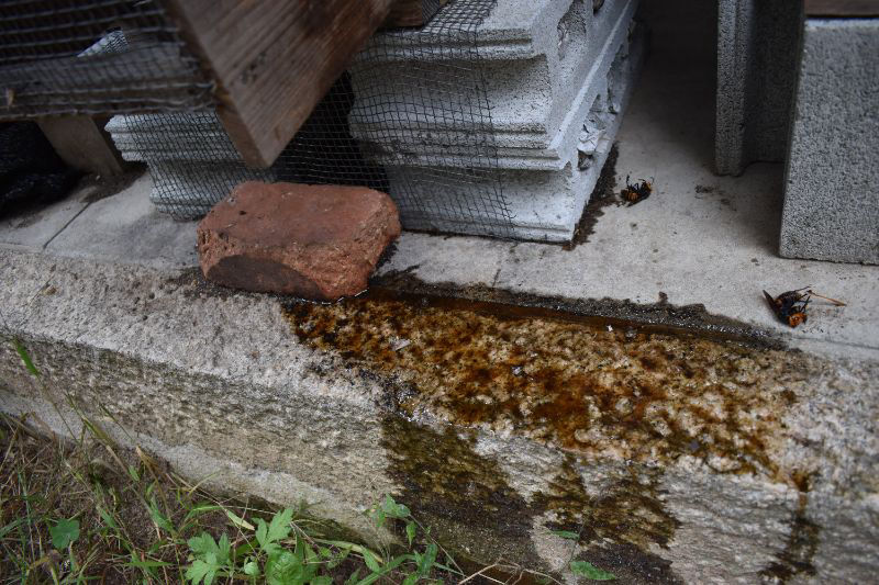 周囲を見渡して、土台部分が濡れています。そこへオオスズメバチが行き来していました。