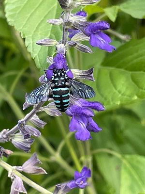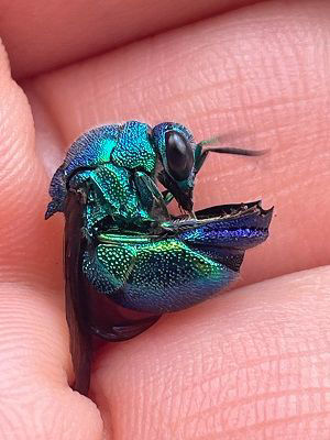 他には、ハナバチではないですがドロバチに労働寄生するオオセイボウ、リンネセイボウなどは毎年沢山確認しています。こちらもとても綺麗なハチです。