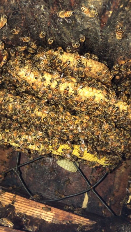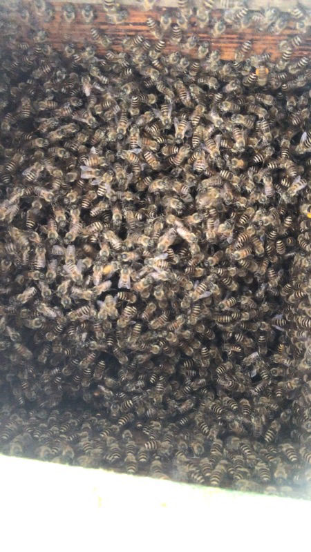 ◎a群の蜜切りを行いました。5段から4段になりました。先日の反省で最上段を多く叩いて蜂たちを下段に追いやろうとしたのですが、怒らせ過ぎてかなりの量の蜂達が外へ出てきました。