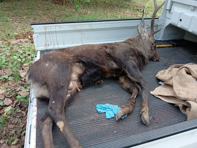 朝、蜂場の見回りに行くと、崖の方でガサガサ音がしてまして、畑の縁にかけていた罠に、鹿がかかってました。8月の猪以来、約2カ月ぶりの獲物。今年はそんなに本腰いれて有害鳥獣駆除に取り組んでなくて、この罠も5月ごろに設置したまま放置してました。ここは蜂場のすぐそばなんで、もしかかってたら音でわかるだろと思ってここにかけたものの、蜂場という人の気配のする空間を嫌ってか、今まであまり獣の気配を感じなかった場所です。秋になって、発情やら冬前の食いだめやらで、鹿の動線が変わったのかもしれません。