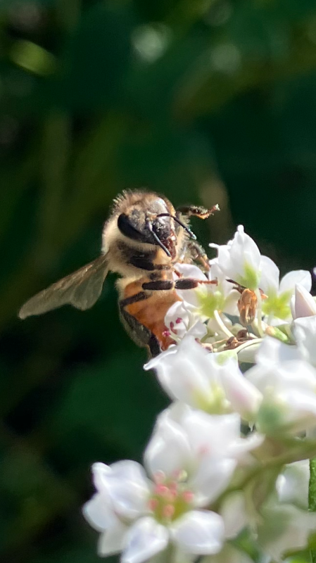 そして10月に入り、自転車に乗っていたとき「なんか臭いなー」と思ってあたりをみると、近所にソバの花の畑があることに気づきました。ソバの花は臭いけど、ミツバチにとって蜜源のひとつであることを知り、とても嬉しい気持ちになりました。「訪花しているミツバチはうちの子たちかなー。いとしいなぁ」と写真を撮りました。