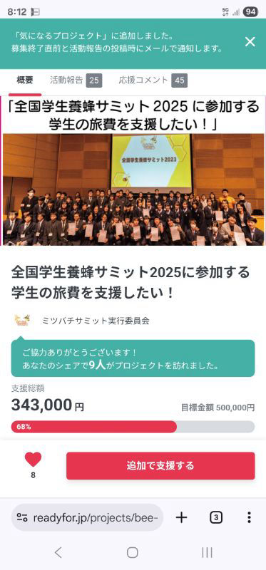 「全国学生養蜂サミット2025に参加する学生の旅費を支援したい!」に御協力を‼