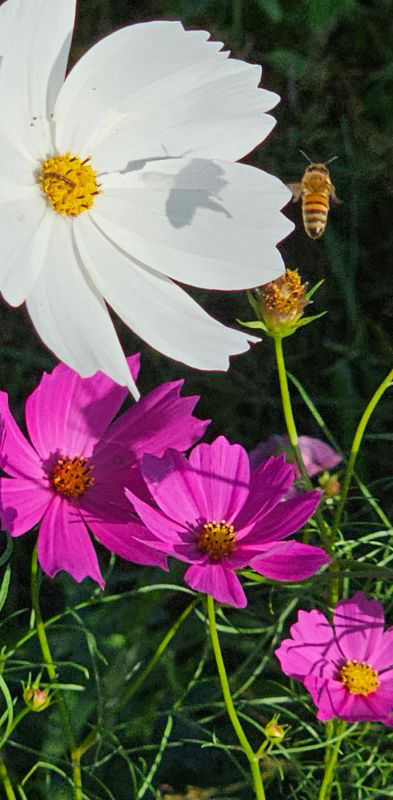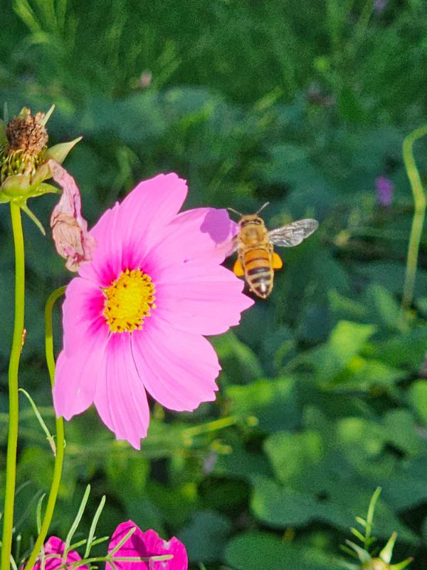 コスモスを訪れる西洋ミツバチ