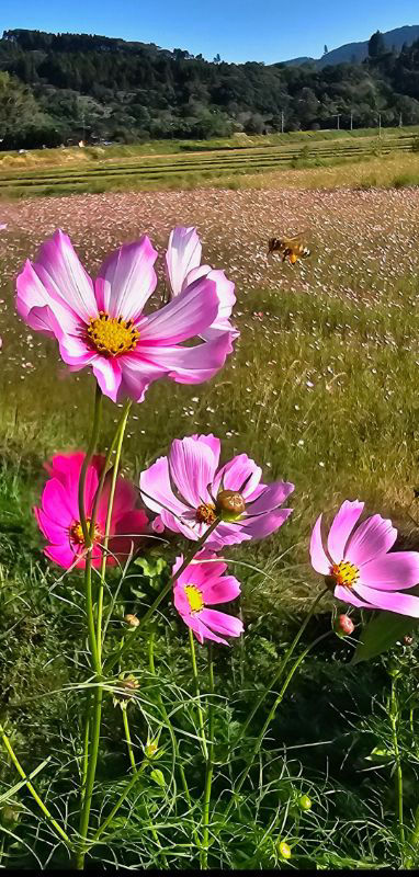 コスモスの花が蜜蜂で賑わっていました。