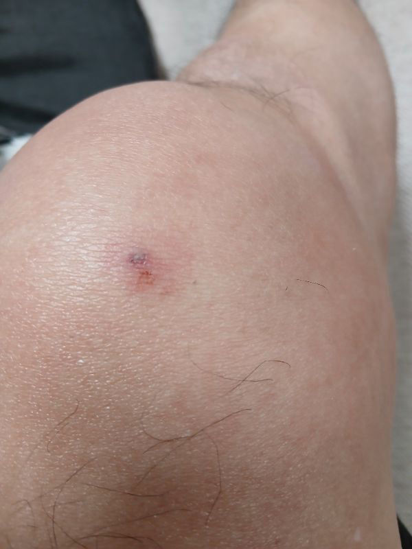 すぐにナイフで針を削ぎ、ポイズンリムーバーで毒を吸い出す。 刺された周辺は早速膨らんで蕁麻疹に。毒が体に回らないように、右足の付け根の血管を押さえる。