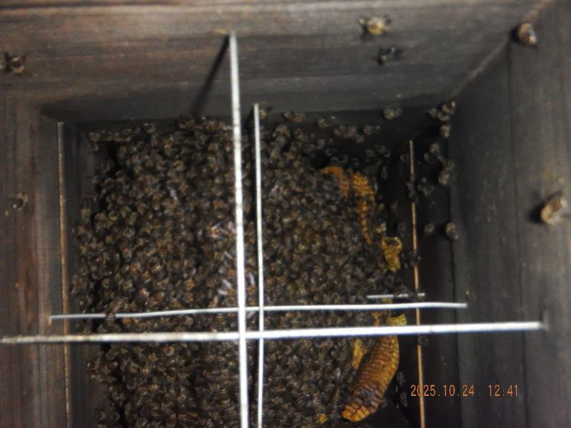 令和7年10月28日 火曜日 大分山荘にて:No.2冬越し群の蜂蜜を冷蔵庫で保存していたので、結晶化して居ますので、温蔵庫に入れましたね。蜂の巣湖は水滴が上がっ