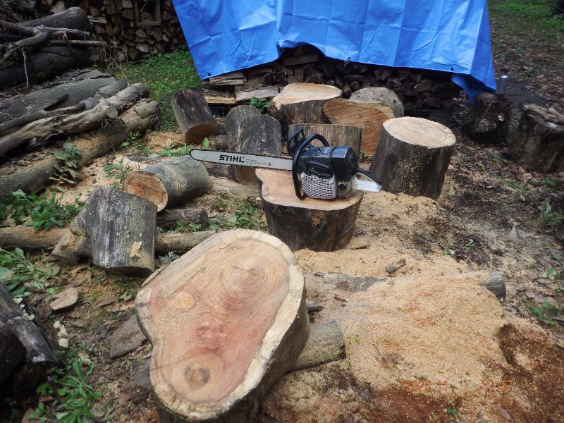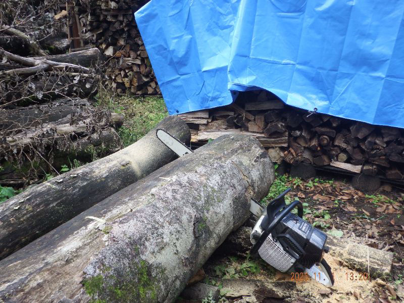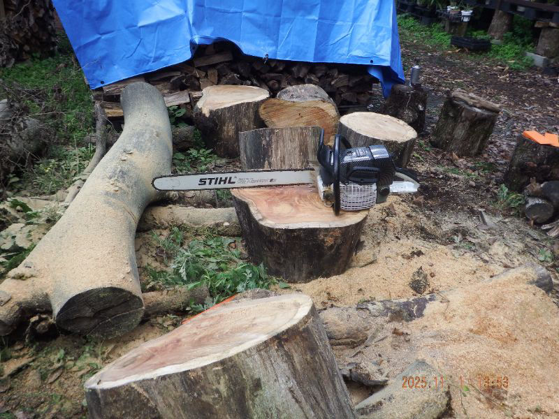 令和7年11月1日 土曜日 大分山荘にて:4年前に倒していた、赤欅を薪用にカットしましたね。板材用に置いて居ましたが、要らなくなりましたからね。