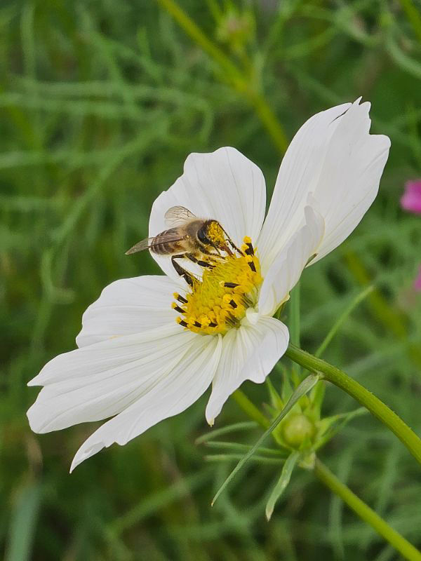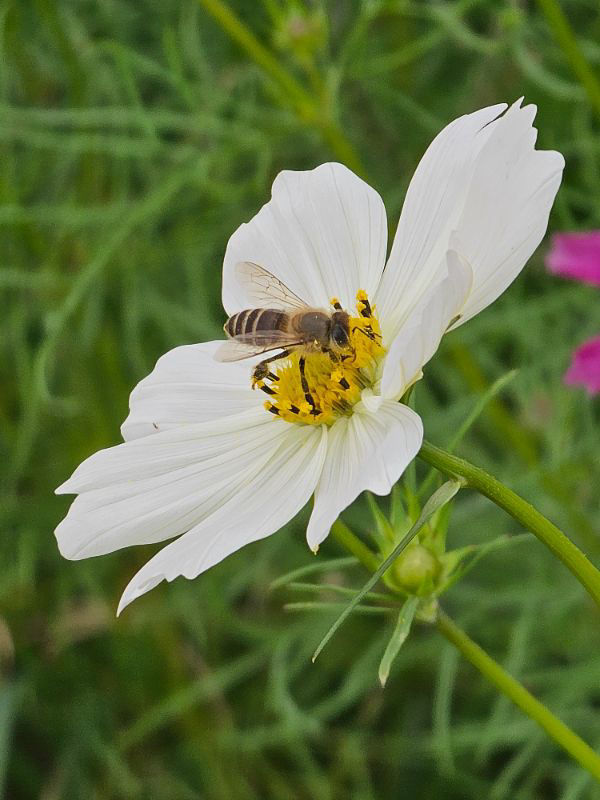 コスモスを訪れる西洋ミツバチ