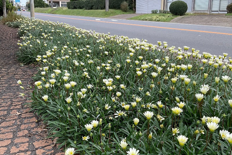 一ヶ所にあった白いガザニアが伸びていたので、雑草で荒れていた部分に挿し芽をしました。丈夫ですぐ根付いて広がってくれました。葉は一年通して緑、花期はとても長く、何より雑草が出ない、優れたグランドカバーです。