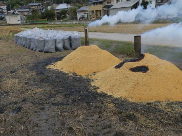 朝7時に点火ある程度焼けた時点でモミガラを被せ焼いています。