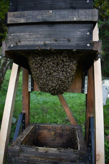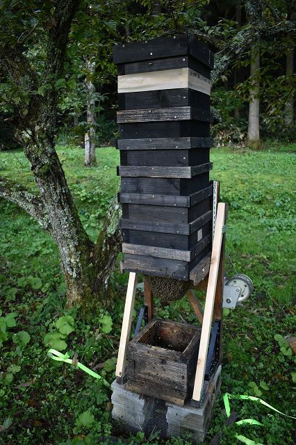 春には越冬元巣5群いましたが、分蜂後に1群が早々とリタイヤしていました。分蜂群は待ち箱に見向きもせずに、全て山の彼方に旅立って行ったそうです。